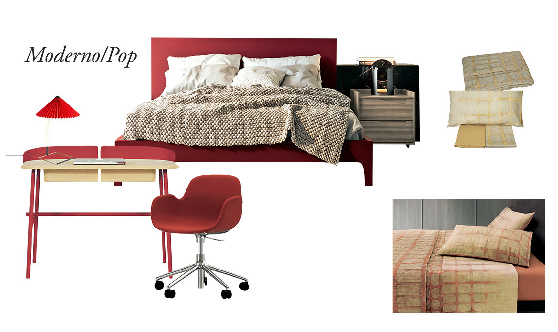 Il design rigoroso del letto è trasformato dal colore caldo per eccellenza, che si posa anche su tessuti e mobili creando un twist di stile. Come vestire il letto? Alle linee squadrate e al colore d’impatto si abbinano lenzuola e copriletti in tessuti leggeri, dal prezioso decoro geometrico di ispirazione architettonica. In tonalità tono su tono oppure a contrasto, ma sempre soft per dare un senso di leggerezza.