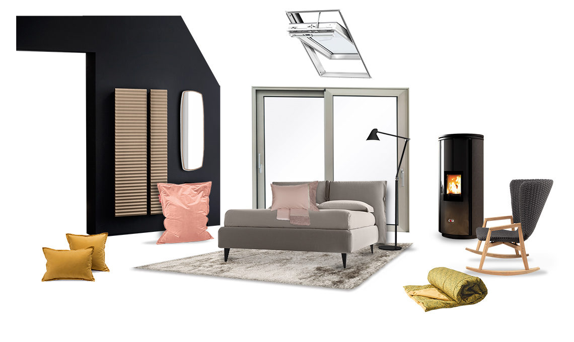 Radiatore [Arblu, cm 55x180h € 1.453], poltrona a sacco Original Slim Velvet [Fatboy, cm 120x155h €179,95], specchio Match [Calligaris, cm 65x180 € 510], portafinestra sistema Domal serie C160 [Camel Diva, su progetto]. Finestra GGU Integra Elettrica [Velux, cm 55x78 €1.111], letto imbottito Eden Advance [Noctis, cm 195x230x111h € 1.843] con lenzuola Galuchat [Fazzini € 149], tappeto Shiny [Calligaris, cm 170x240 € 395], piantana NJP [Louis Poulsen € 565], stufa a pellet Elegant Ermetica [Anselmo Cola, cm 54x57,4x 121,1h prezzo dal rivenditore], poltrona Knit Rocking Chair [Ethimo, cm 88x84x114h € 1.900].