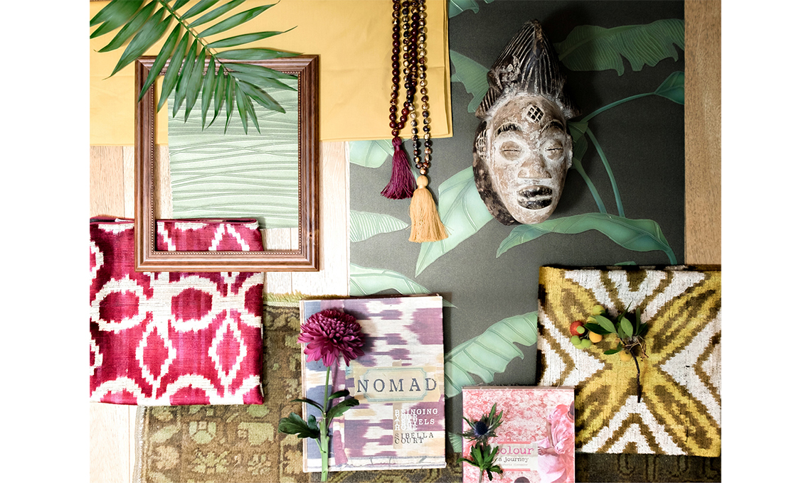 Prima di cominciare è stata creata questa moodboard con ispirazioni etniche e jungle. Gli oggetti ispirazione? Una maschera africana [Officina 33 €250], i rosari thailandesi [Beautiful Shop €45 e €55], i copricuscini in velluto di seta [Les Ottomans].