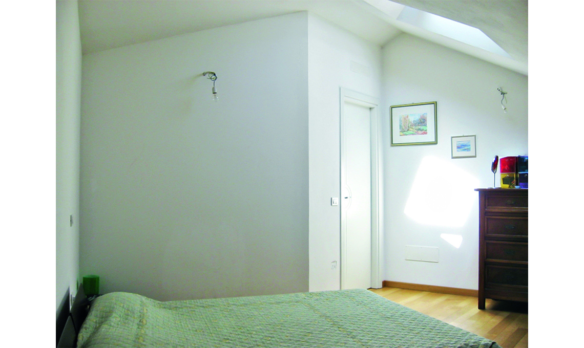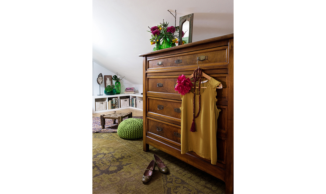 Il comò era davanti alla porta e non riusciva ad arredare la parete troppo ampia. Non sempre c’è bisogno di un muro per collocare un mobile: ora il comò è davanti al letto, sotto lo spiovente del tetto, e alle sue spalle c’è uno spazio nascosto che funge da mini ripostiglio.