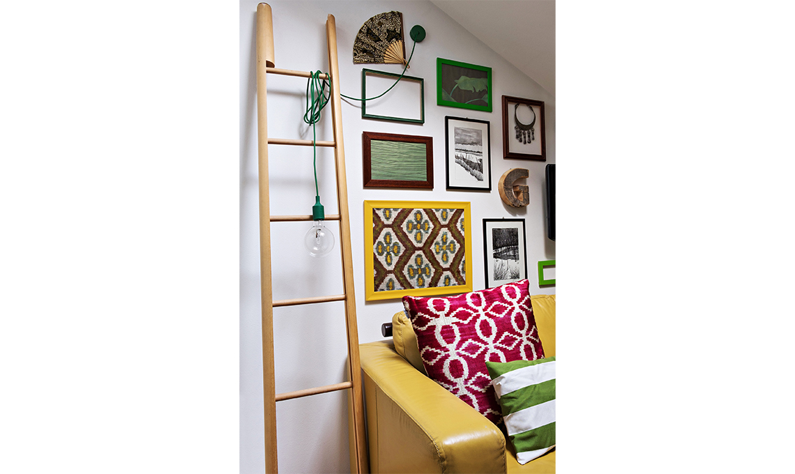 Una scala apri-e-chiudi acquistata da tempo e mai utilizzata è diventata l’elemento decorativo che regge la sospensione, un’altra versione colore della lampada E27 [Muuto]. Nasce da soffitto, ma qui diventa un’applique diversa dal solito!