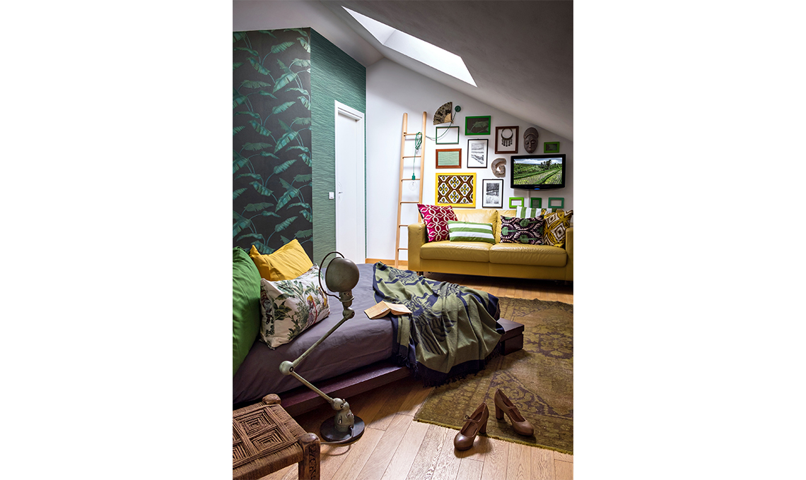 Il letto appoggiato alla parete diagonale è protagonista della stanza. Sopra il lenzuolo di cotone, un plaid in misto lana [Chiodi Bianco Casa €43,50 e €139]. Tappeto [Officina 33 €800]. Sul divano cuscini in velluto di seta [Les Ottomans €135 il grande €80 il piccolo] e in cotone, realizzati con tessuto al metro Sofia [Ikea €8,99/m]. Uno dei comodini è un tronco che richiama il lato più materico dello stile ‘jungle’. Sopra, sospesa, l’ormai iconica lampada E27 [Muuto €65]