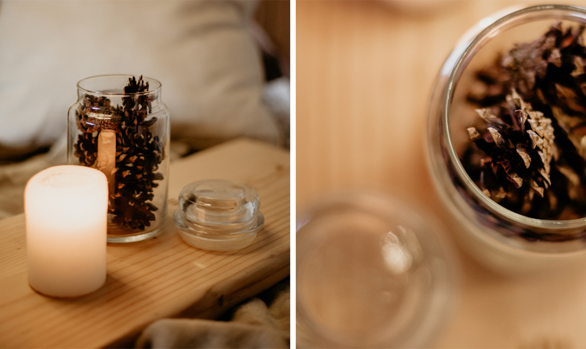 Il profumo della Natura è qualcosa di speciale, e i danesi lo sanno bene. Riempi di pigne, foglie e rami dei vasi in vetro trasparente e distribuiscili strategicamente nella stanza!