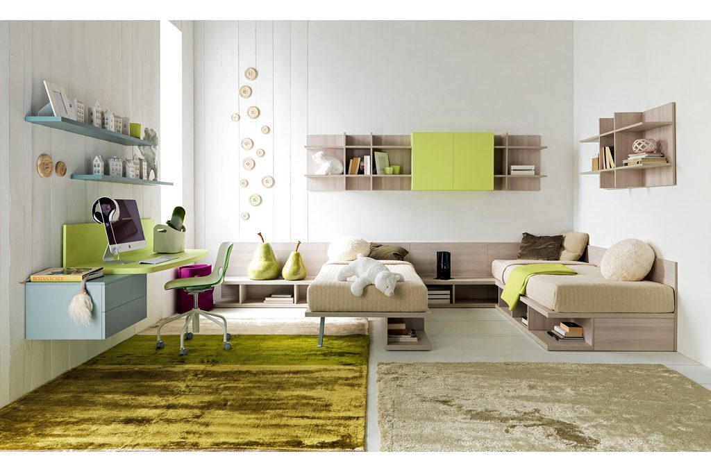 Eccoci invece in una camera per due fratelli: nella composizione New 138, i pannelli Foster collegano i due letti Montreal e fanno da comodino; lo scrittoio Giove è sospeso [Doimo Cityline]