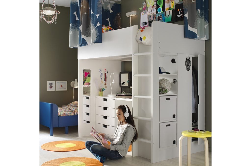 In una camera mini, un 'monoblocco' concentra il mondo del ragazzino/a; in più, in alto, c'è la tenda salva-privacy! Letto a soppalco Stuva, con 4 cassetti e 2 ante [cm 207x99x193h €426]...e rimane l'angolo per il fratellino.Tutto Ikea