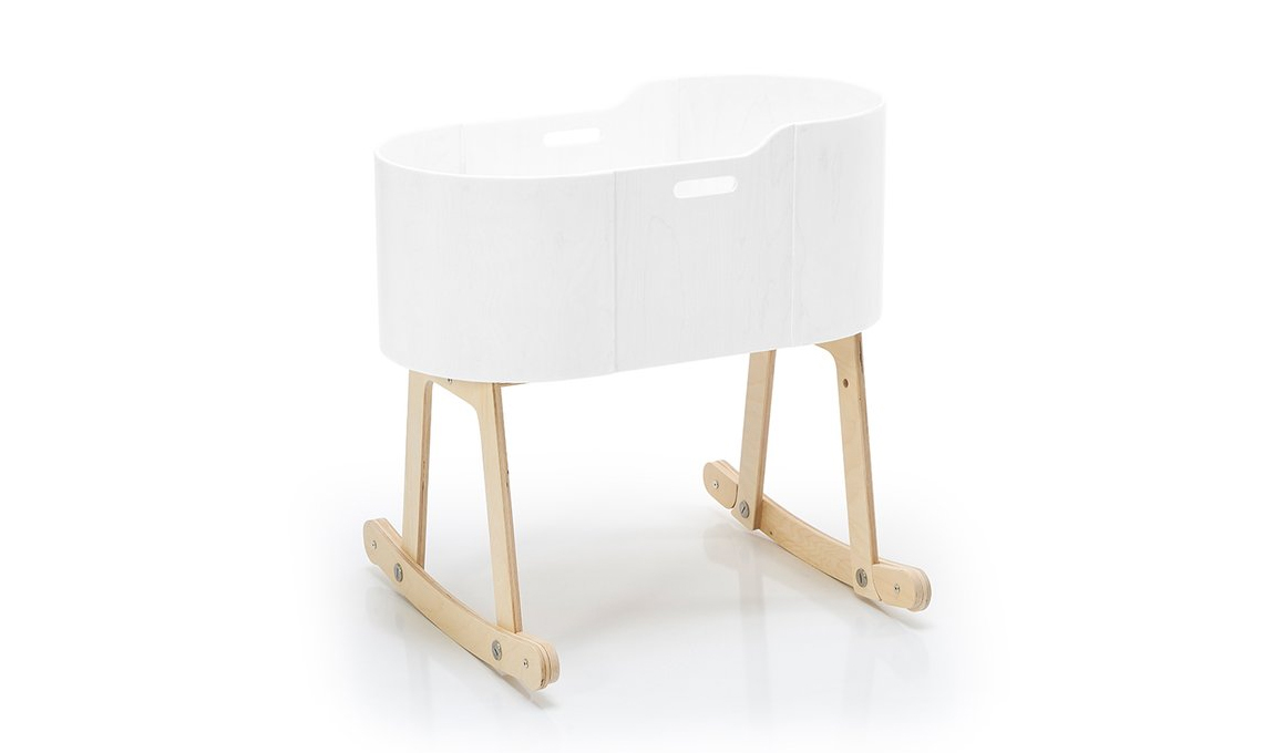 Una culla basculante leggera e intelligente che consente alle mamme di trasportarla comodamente da una stanza all'altra. Il meccanismo oscillante può essere fermato grazie ad un sistema di bloccaggio dei piedi. La culla è in legno compensato di betulla curvato e verniciato con colori a base d'acqua.