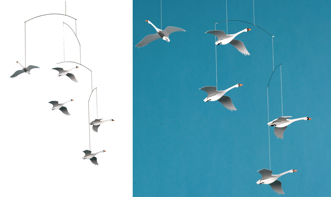 Tanti cigni in cartone sospesi ad una sottile struttura in metallo. Questa giostrina può essere collocata sopra al lettino, al fasciatoio o fissata al soffitto o al lampadario.