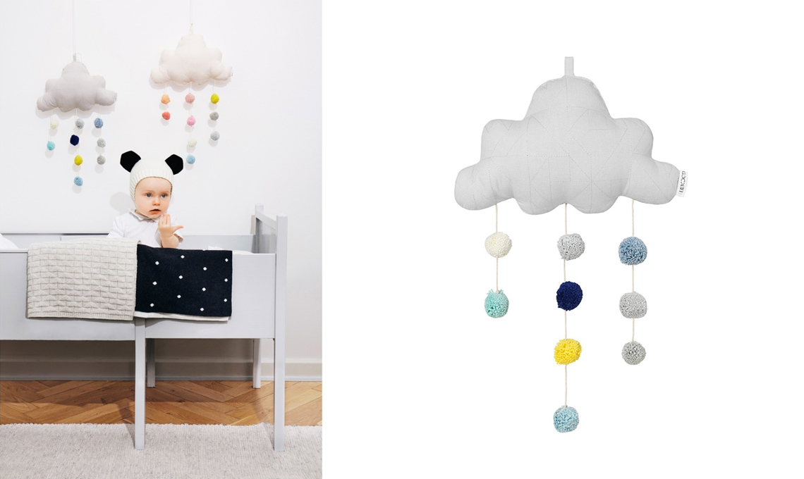 Morbidissima giostrina realizzata in cotone biologico. Una nuvola imbottita dalla quale pendono tanti ponpon colorati che simulano le gocce di pioggia.