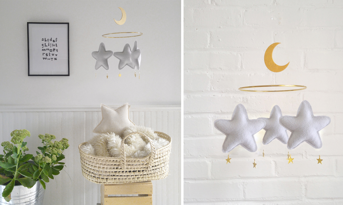 Tre grandi stelle in feltro grigio perla, un anello in metallo a cui sono sospese e piccoli elementi metallici, una grande luna e tante piccole stelline. La cameretta sarà inondata di luce brillante ed elementi giocosi e vivaci.