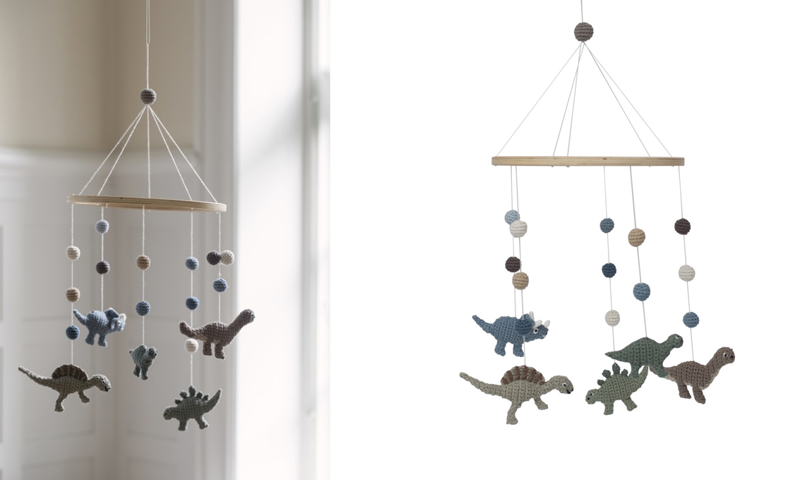 La decorazione di Sebra si compone di cinque dinosauri realizzati all'uncinetto e fissati ad una leggera strutturina in legno. Con il vento gira su se stessa in un delicato balletto.