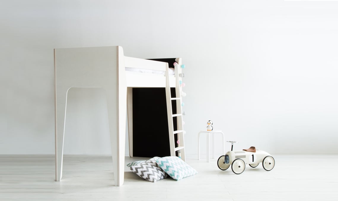 I bambini amano i letti a soppalco e questo di Lumokids è adatto anche ai bambini più piccoli. Potete prima acquistare la versione corta (160 cm) e successivamente, estenderla fino a 200 cm con il kit di conversione. Testiere solide, sono disponibili in bianco o nero.
