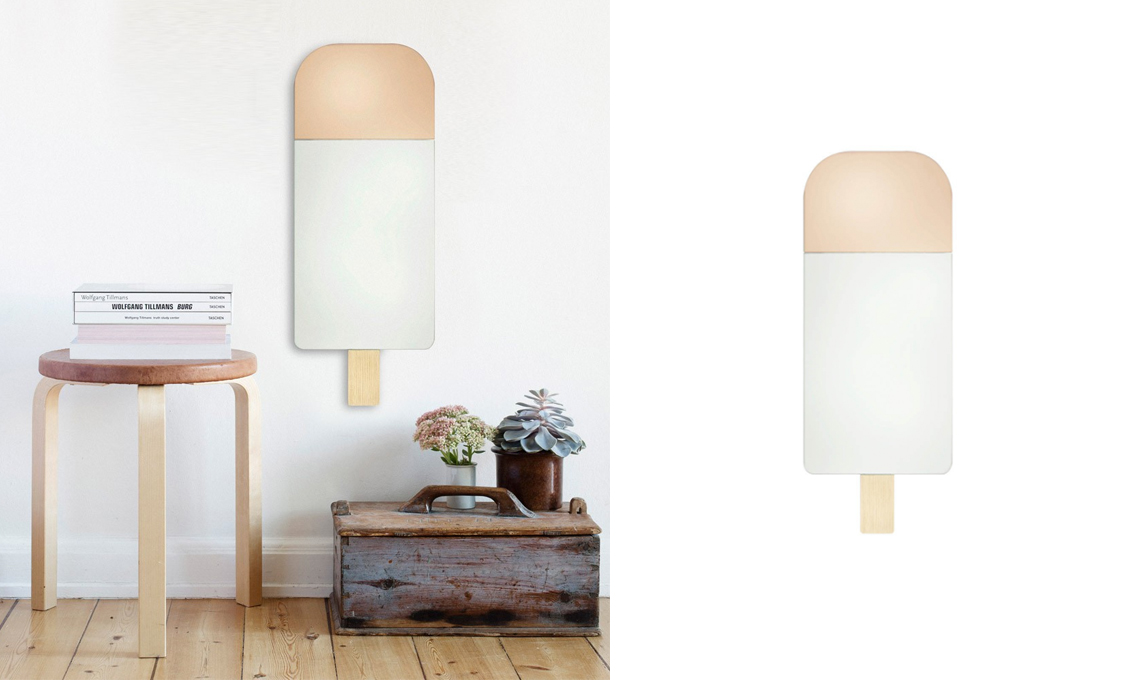 Divertente modello a forma di stecco gelato con una parte specchiante e una in legno di quercia europea.
