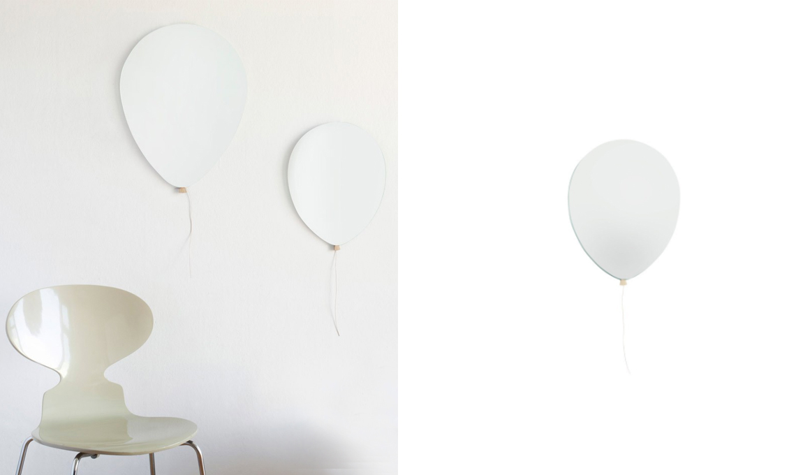 Gli artisti Tor e Nicole Servé hanno creato questo divertente specchio a forma di palloncino. Disponibile in due dimensioni, ha piccoli dettagli in legno e cuoio.