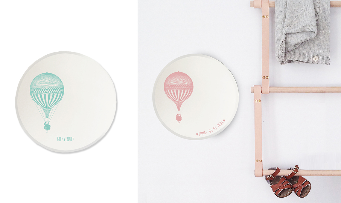 Specchio rotondo con mongolfiera e dipinto a mano. Disponibile anche personalizzato con il nome del bambino e la sua data di nascita. Adatto anche come regalo elegante e utile per un bimbo in arrivo.