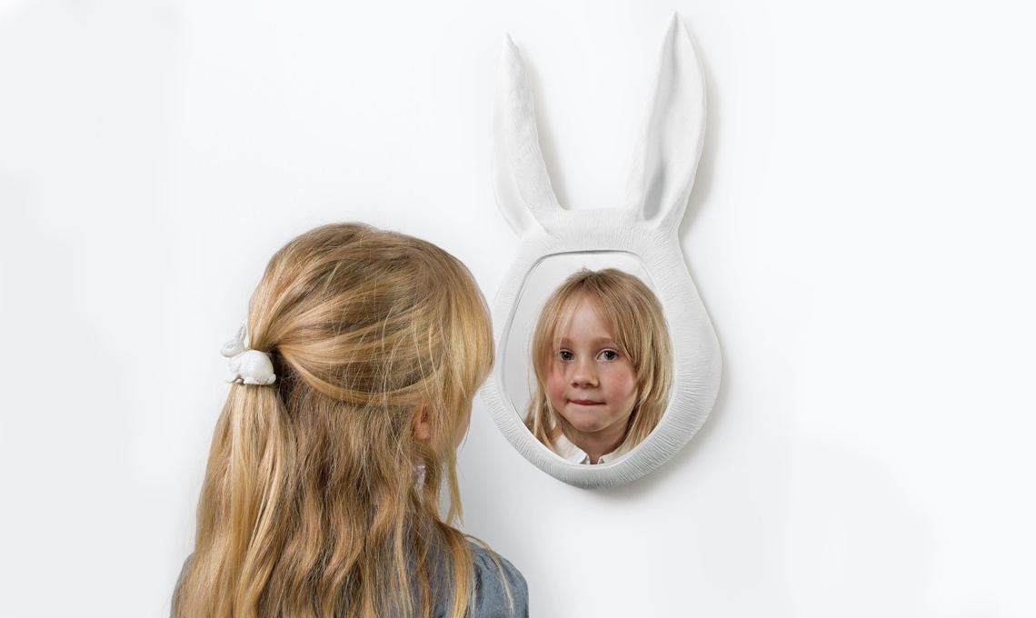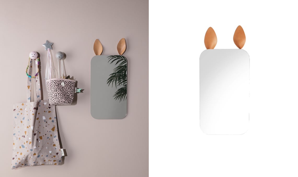 Specchi divertente con orecchie in cuoio che ricordano quelle dei conigli. Fa parte della nuova collezione bambini del brand danese.