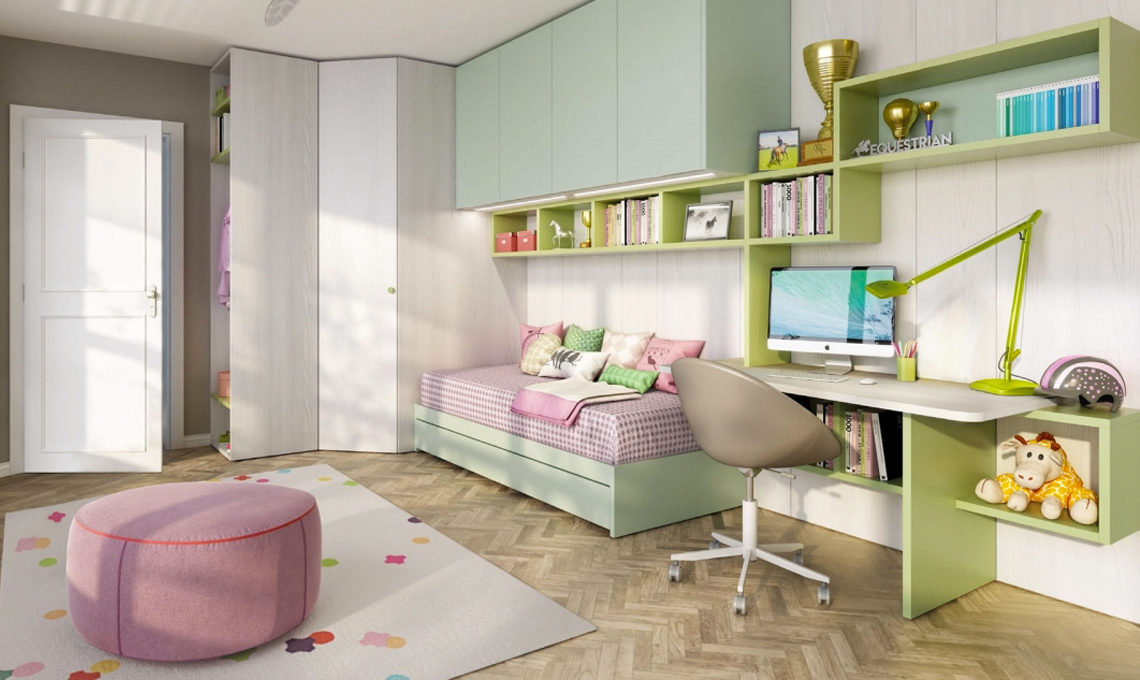 Tra le proposte anche il bellissimo verde salvia che troviamo protagonista nelle camerette CM35 e Smile 29 di Giessegi e il verde Flora dei modelli YC307 e Kc302 di Moretti Compact.