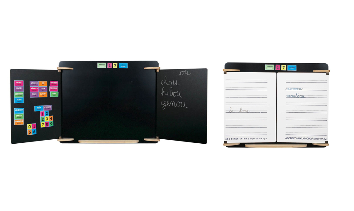 Anche questa lavagna presenta una superficie (quella interna) da utilizzare con i gessetti e una esterna a righe su cui allenarsi a scrivere. Viene venduta insieme ad una scatola di colori, 1 pennarello, 1 calendario perpetuo e stickers tagliati e riposizionabili.