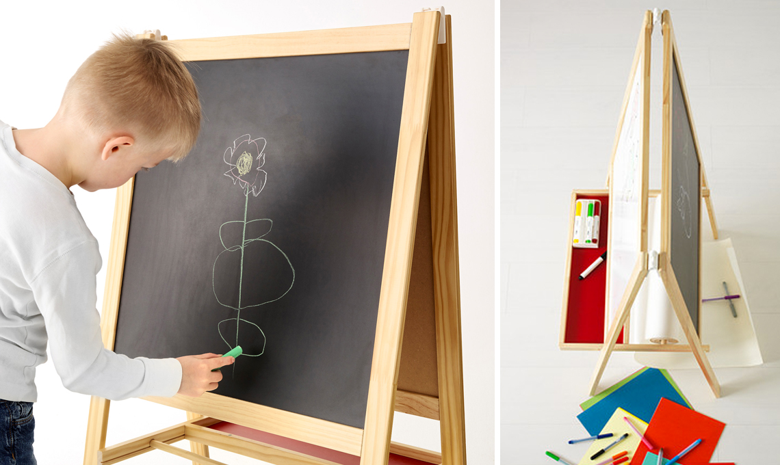 Un classico nelle camerette in stile nordico, questo cavalletto in legno è composto da una lavagna in ardesia da usare con i gessetti e da una lavagna bianca per pennarelli. Nella parte sottostante è inserito un rotolo di carta da disegno per trasformare la lavagna in un vero cavalletto da pittore.