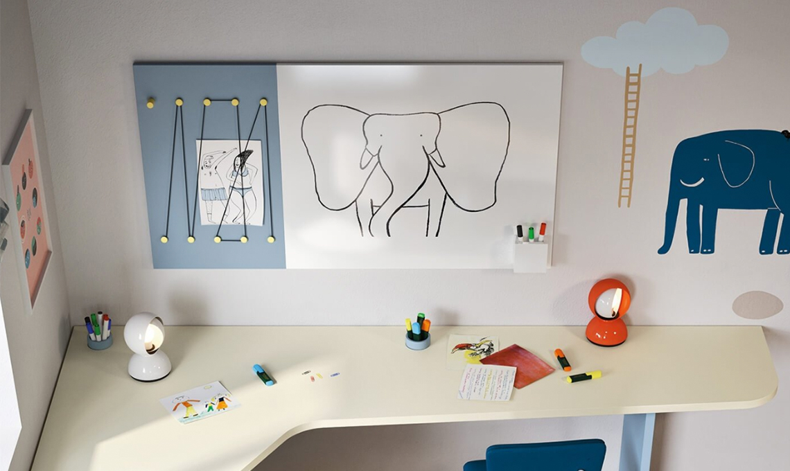 Le camerette di Nidi sono studiate nei minimi particolari e comprendono moltissimi arredi e complementi aggiuntivi. Tra questi c’è la grande lavagna bianca graphic, munita di porta pennarelli integrato. La lavagna può essere completata con le bacheche colorate dello stesso brand.