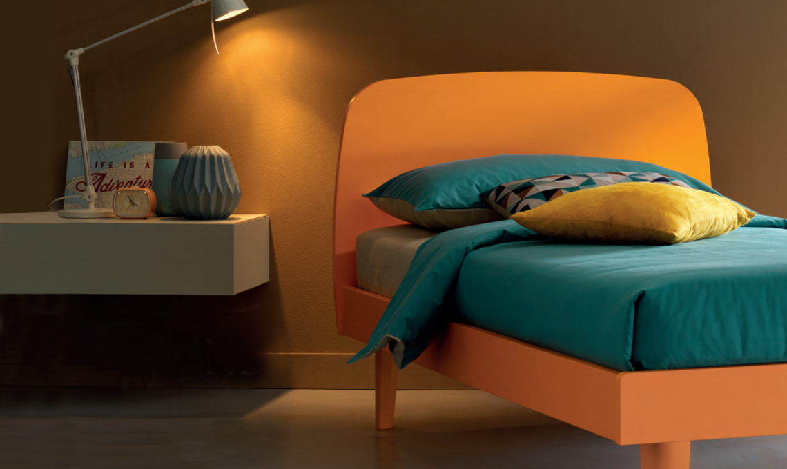 Modello in legno in un colore brillante. Una originale sfumatura di arancione per un letto davvero protagonista della stanza.