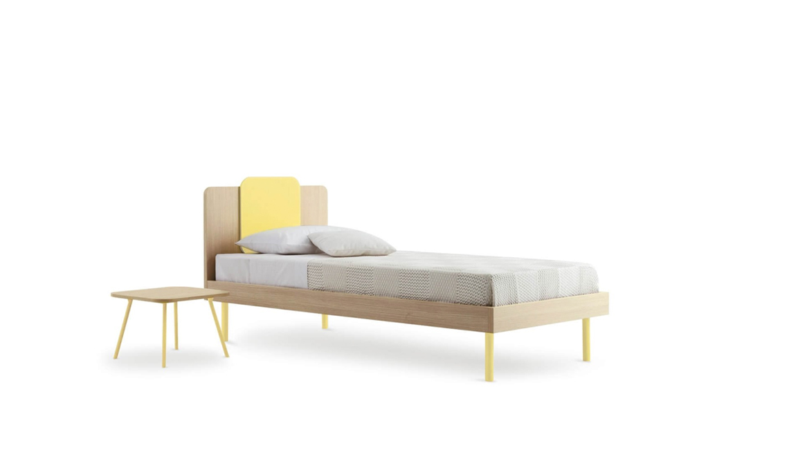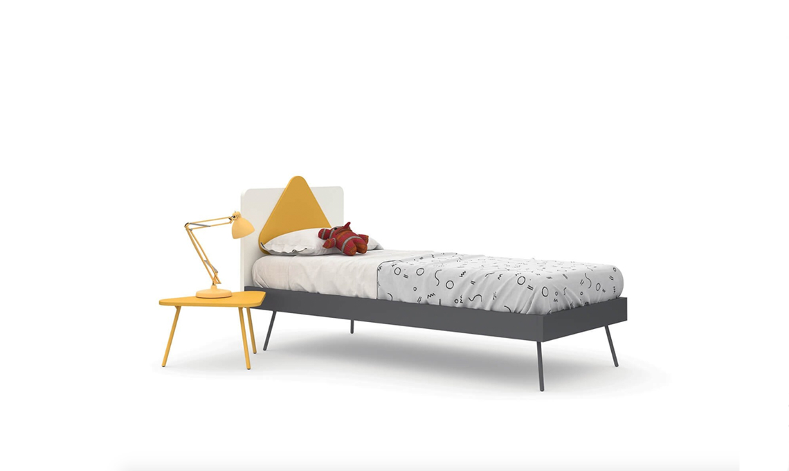 Il letto Trio ha un piccolo triangolo applicato alla testiera. Anche questo modello si combina con le tante gambe e i giroletti disponibili, attrezzabili con letto estraibile, cassetti e rete rialzante. È disponibile anche il comodino coordinato.