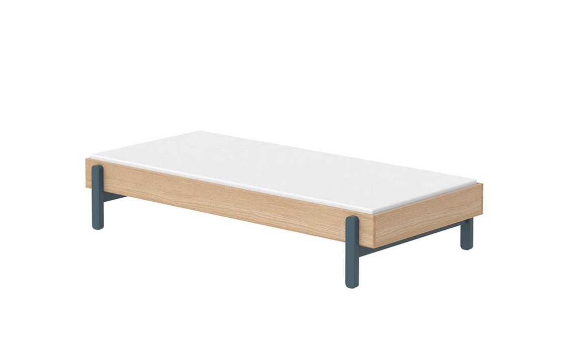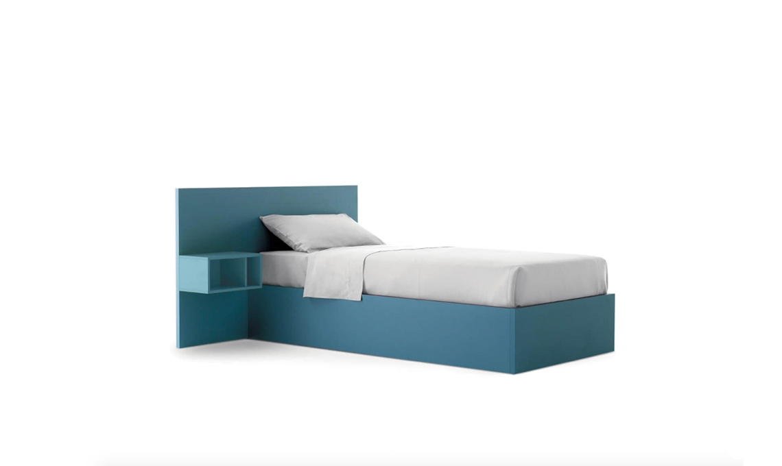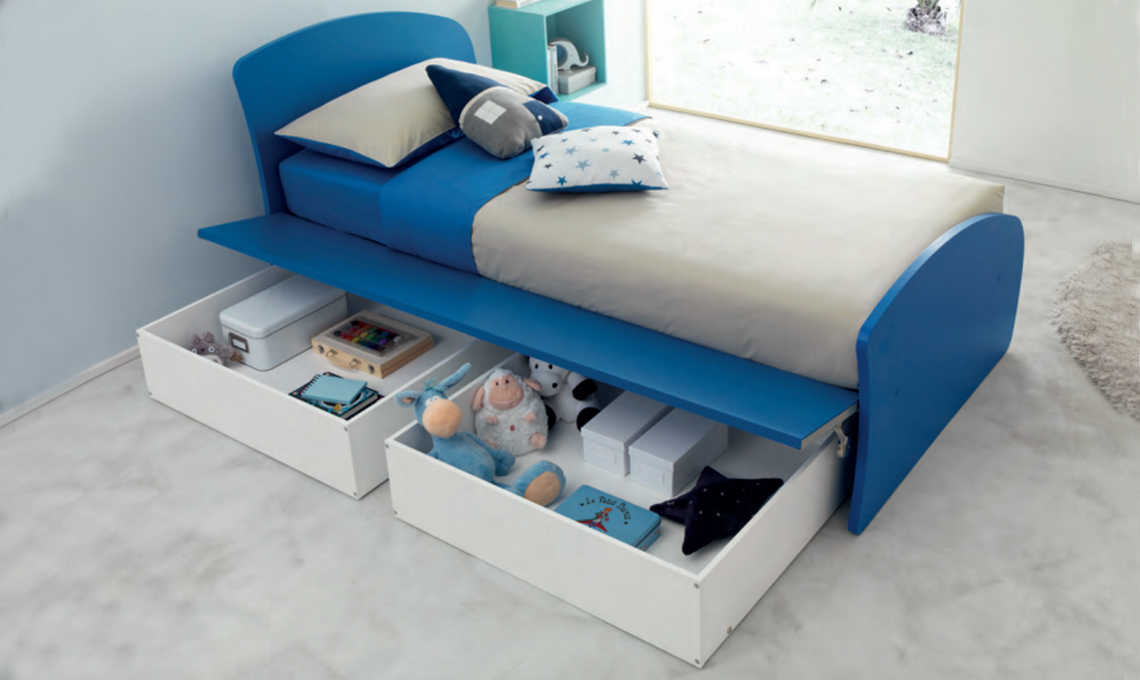 Il letto è formato da testata e pediera realizzate in pannello ecologico LEB, in questo caso laccato blu. Sotto il letto, sollevando il fascione laterale, trovano posto due cassettoni o un secondo letto estraibile.