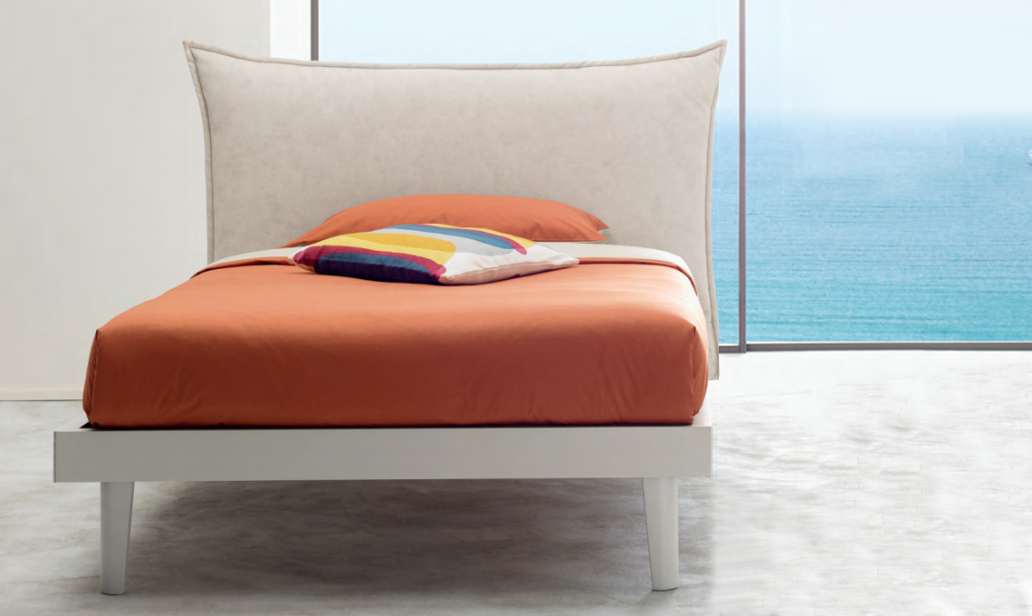 Anche i quadrati hanno gli angoli arrotondati, come nella testiera Quadro e nel vassoio coordinato, che si può usare come comodino. Il letto si può scegliere con pediera o con gambe, oltre che con tanti giroletti diversi, letto estraibile, cassetti o rete rialzante.