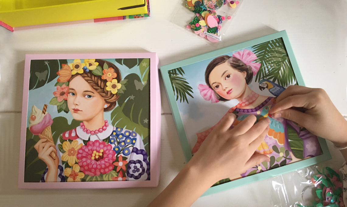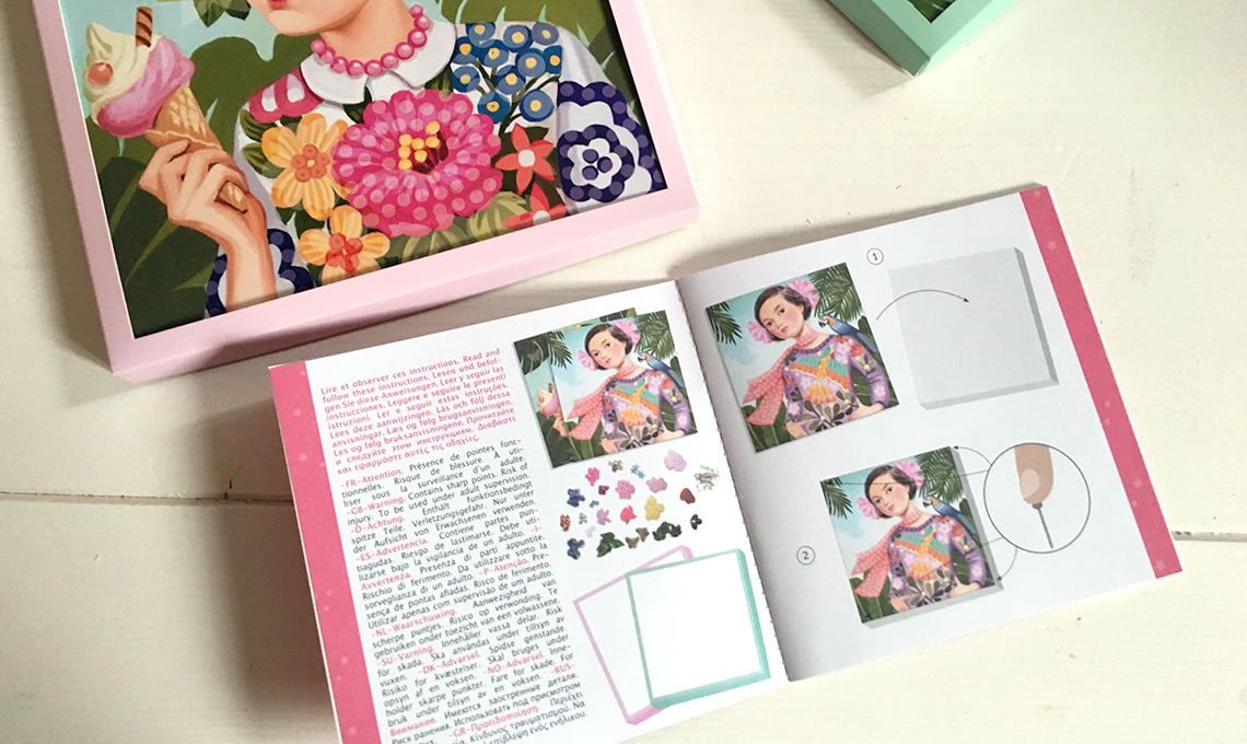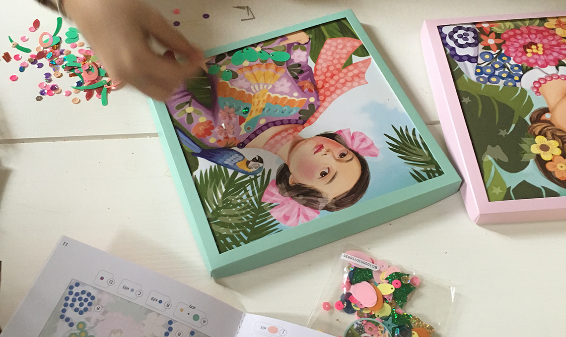 Un gioco adatto dagli otto anni, un'attività creativa e giocosa che richiede pazienza e precisione. La scatola comprende: 2 stampe illustrati, 2 strati di gomma piuma, 2 cornici di carta, paillette, spille e 1 libretto esplicativo.