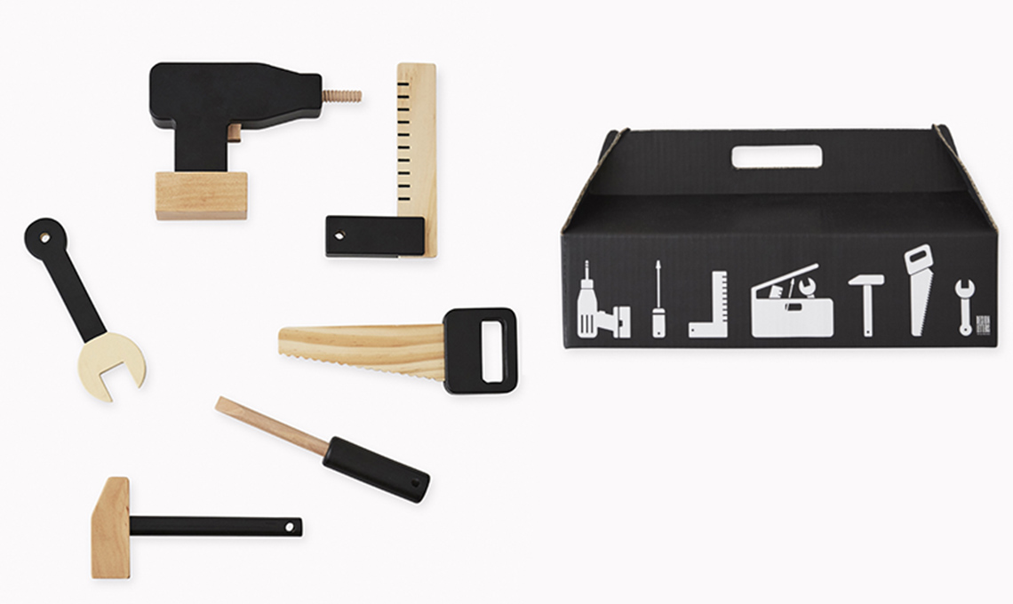 Ci sono il trapano, il martello, la chiave inglese, la sega, il cacciavite... È proprio come quella dei grandi, la cassetta dei mini attrezzi [Design Letters €33,50].