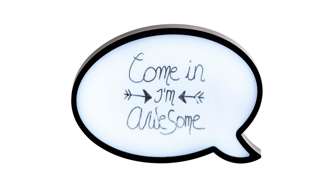 Versione a forma di nuvoletta dei fumetti per lasciare messaggi luminosi a chi entra in camera. Sulla superficie opaca è possibile scrivere frasi e pensieri usando il pennarello cancellabile nero in dotazione.