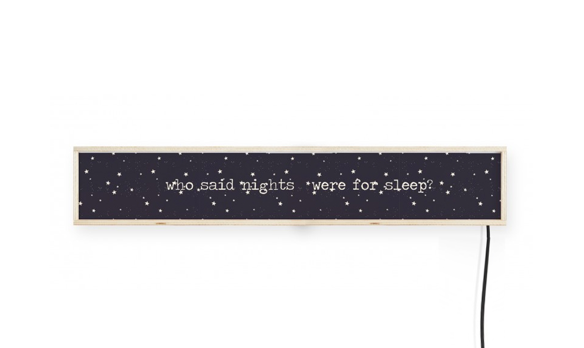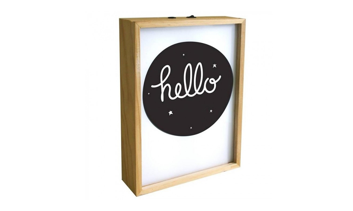 Lightbox in formato A4 in legno con scritta intercambiabile. Il brand produce infatti dei set di acetati trasparenti con disegni, messaggi e grafiche per rendere sempre unica la lightbox. Il pannello frontale è formato da un doppio perspex che permette di sostituire facilmente il poster. Può essere appoggiata in verticale, orizzontale o appesa al muro.