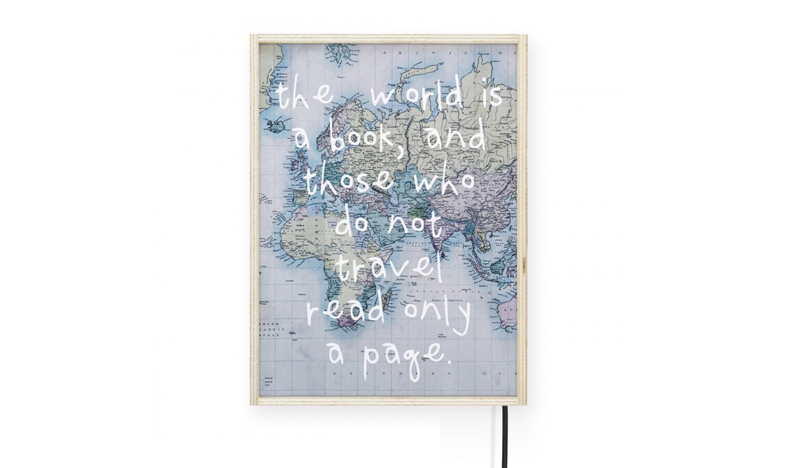 Per gli amanti dei viaggi, il brand spagnolo propone una grande lightbox con cartina geografica e il messaggio "the world is a book, anche those who do not travel read only a page"