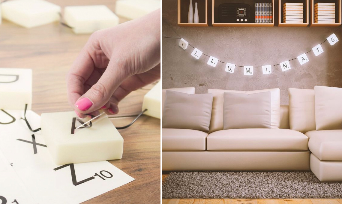 Per gli appassionati del gioco da tavola Scarabeo c'è la lightbox a ghirlanda che imita il famoso gioco. Questo set di 10 luci LED personalizzabili e 60 adesivi/lettera intercambiabili è progettato per assomigliare fedelmente alle tessere del gioco. Le luci possono comporre il nome del bambino o un breve messaggio.