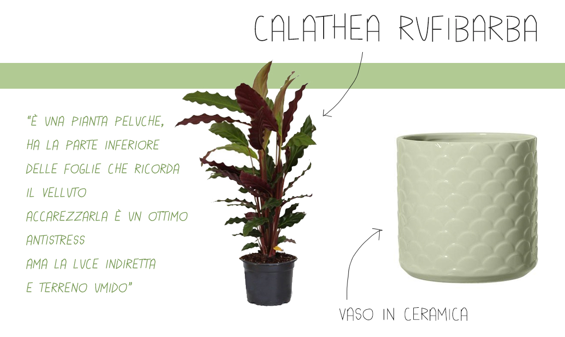 Stanza in stile Jungalow come il modello Smile 24 di Giessegi? Scegliete una bella pianta rigogliosa come la Calathea Rufibarba. Il porta vaso di Bloomingville verde chiaro, riprende i colori della stanza.