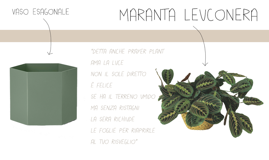 "Detta anche “prayer plant” ama la luce ma non il sole diretto, è felice se ha il terreno umido