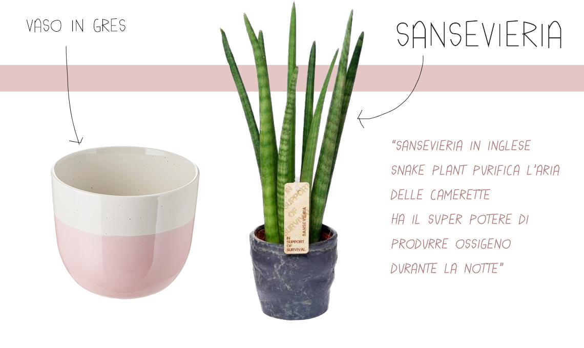 "In inglese “snake plant”, purifica l’aria della cameretta e ha il super potere di produrre ossigeno durante la notte"