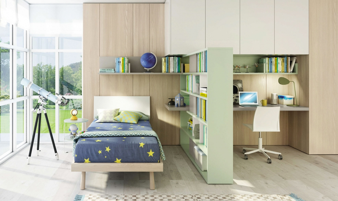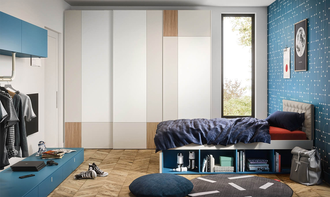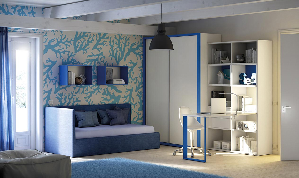 Cameretta sui toni del blu che ricorda il fondo del mare come il modello KC 207 di Moretti Compact? Scegliete l'originale alga Marimo da mettere in mostra nel vaso in vetro di House Doctor.