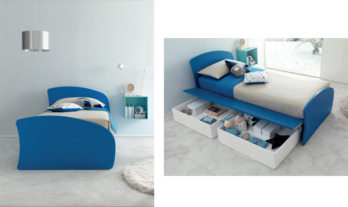 Un letto moderno e dalla bellezza fresca e vivace. VHC33 è formato da testata e pediera in pannello ecologico LEB, laccato blu e sotto il letto, sollevando il fascione laterale, trovano posto due cassettoni (oppure, in alternativa, un letto aggiuntivo estraibile).