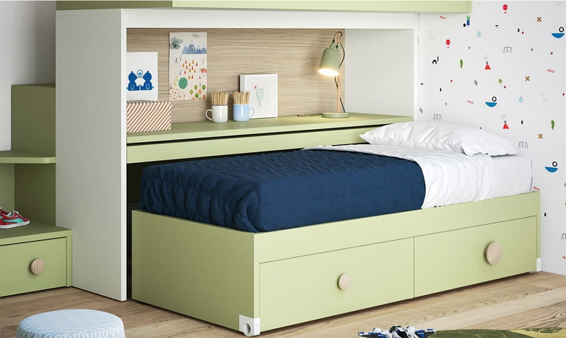 Oltre al classico letto supplementare, la parte sottostante il materasso, può essere utilizzata come storage. Nei grandi cassetti potrete sistemare la biancheria e le coperte, oppure i giocattoli che rimangono sempre in giro per la stanza!