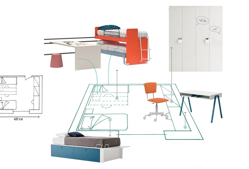 - Castello multifunzione: per non sprecare centimetri, la struttura con il letto a ponte, sfrutta l’altezza della stanza. Accessibile con gradoni dotati di cassetti, sotto il pianale della rete è organizzato con scrivania da cm 200, cassettiera e libreria a tutta altezza. Lo scrittoio è corredato da una libreria formata da tre moduli larghi 45, 60 e 90 cm.