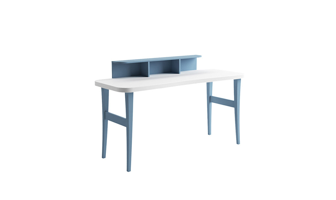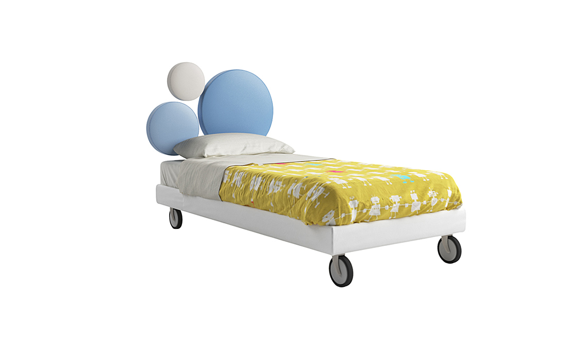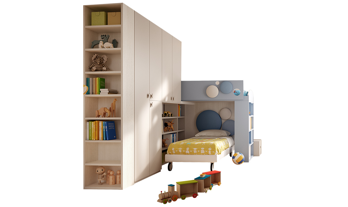 I piccoli dormono su un sistema-soppalco che include armadio e librerie. I letti a castello sono sfalsati con scaletta a cassettoni. L'armadio ha 5 ante a battente ed è dotato di fianco laterale con vani a giorno. La struttura è in finitura Betulla, arricchita da particolari laccati grigio Tele e azzurro Savoia. Per loro due sedie gemelle dalla avvolgente seduta ergonomica in PVC e stabili gambe in acciaio oltre alle scrivanie 7617 in melaminico con piano antigraffio più gambe e alzatina con portaoggetti nel colore azzurro Savoia.