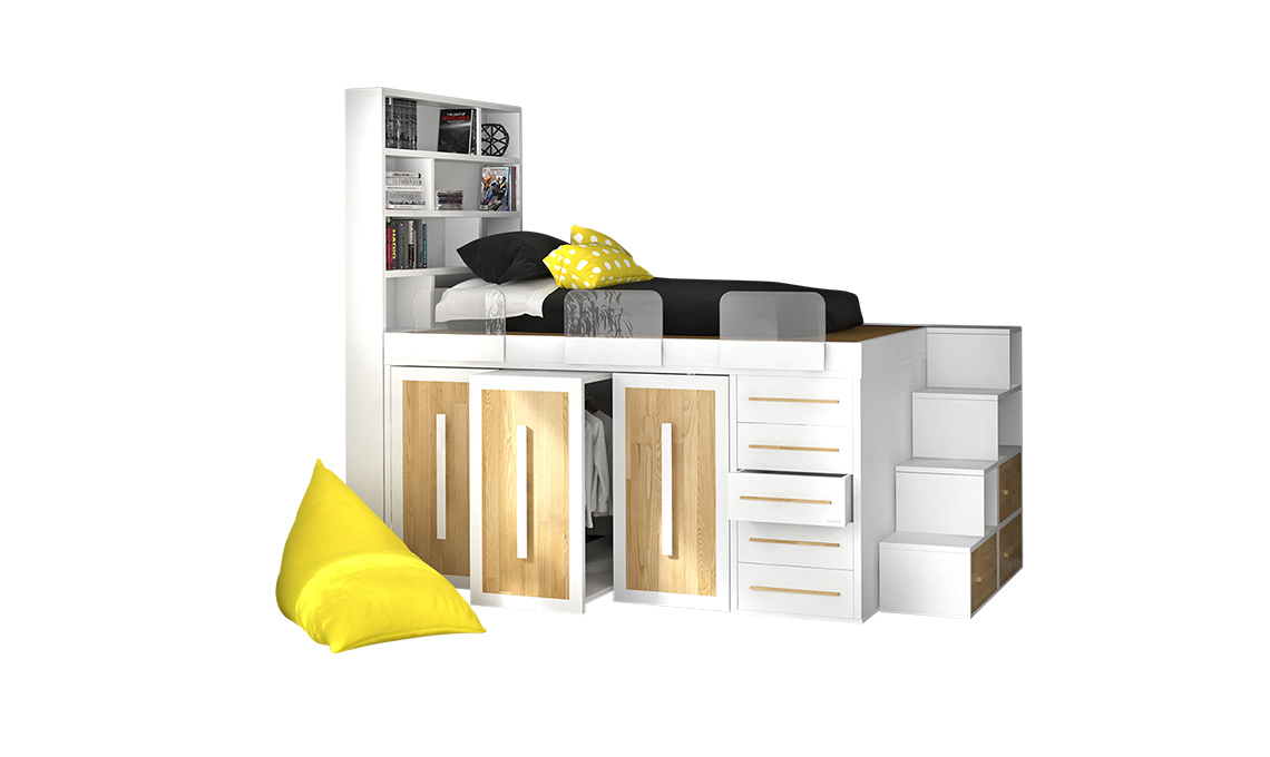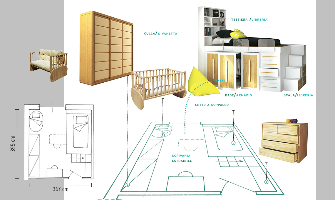 Soluzioni a scomparsa e che sfruttano l’altezza sono il leitmotiv di questa stanza con un grande letto a soppalco che, sotto, ha armadiature e scrivania in moduli estraibili. A questo si aggiungono un ampio armadio, una cassettiera e la culla che si trasforma in lettino/divanetto.