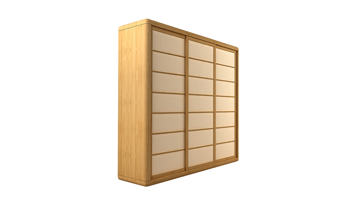 Armadio jap style con ante scorrevoli leggere ma robuste. Privo di parti metalliche, è tailor made: le specchiature possono essere in tessuto, carta di riso, pvc o plexiglas. Letto a soppalco per sfruttare al massimo lo spazio in altezza. Culla/divanetto in massello di faggio con futon in cotone: 100% eco! e cassettiera 3+2 in legno lamellare con 5 scomparti dagli interni in betulla.