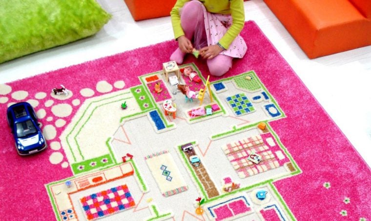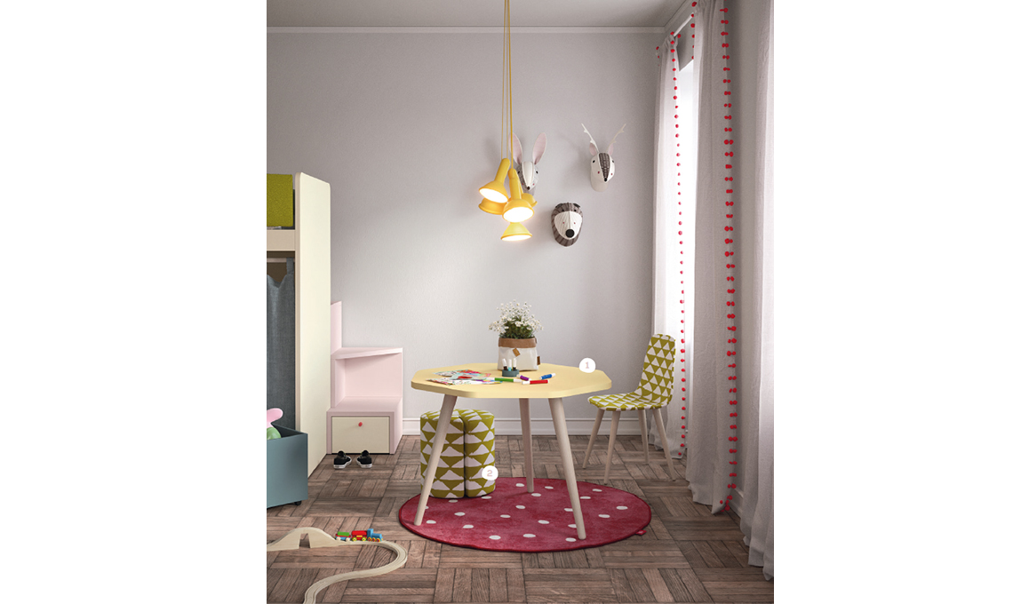 Per giocare basta un po’ di spazio libero al centro della stanza. Sul tappeto Mushroom [ø cm 130], tavolino Woody con piano sagomato, pouf Noel con fessura portaggoetti. Sedia Pod con seduta e schienali imbottiti e rivestiti in tessuto. Tutto [Nidi].