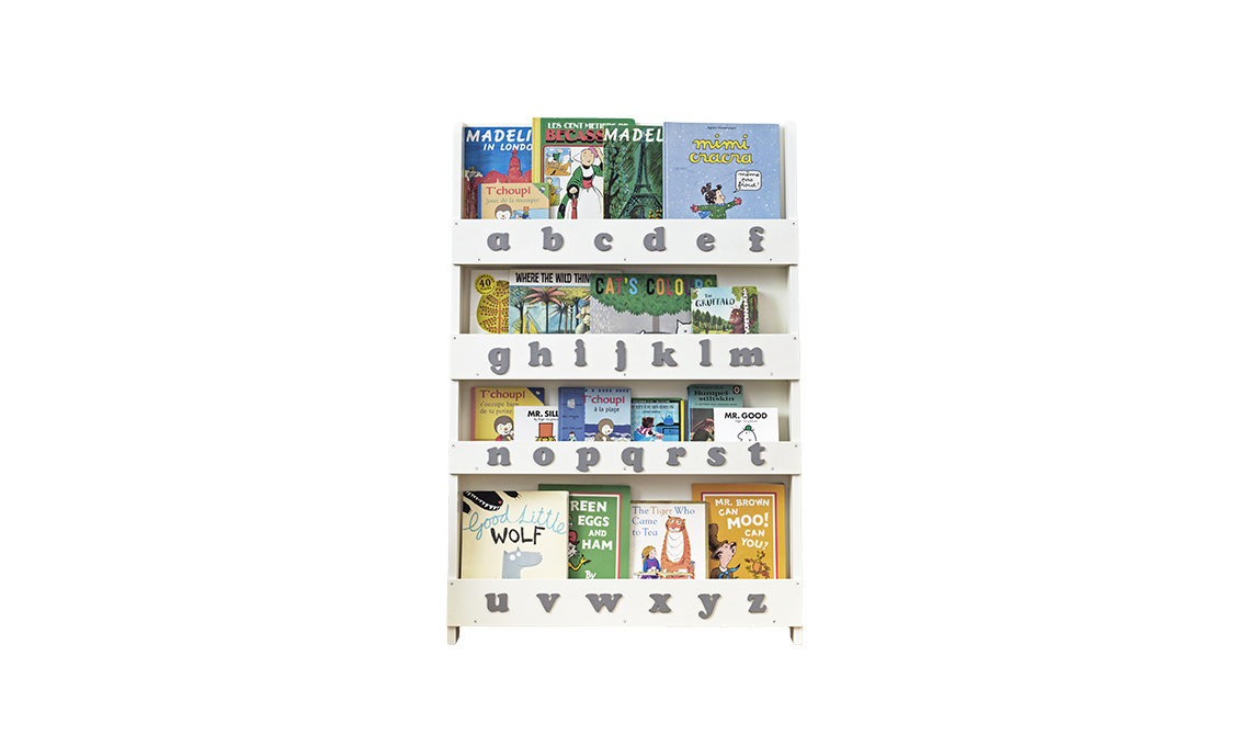Divertente lo scaffale per libri e giochi a forma di coniglio [Bloomingville]! Un invito a usare le cose che ci sono appoggiate, e poi a rimetterle in ordine.