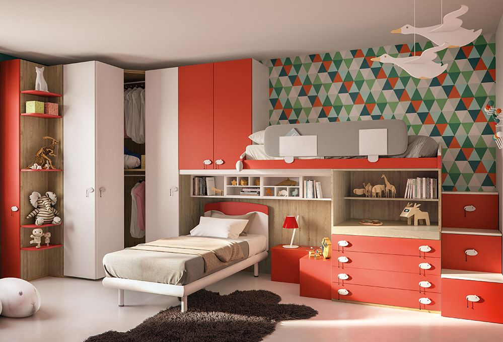 In camera si può sfruttare una sola parete? In alternativa ai sistemi a castello puoi installare una piccola cabina di 1 mq completata dai pensili a ponte sopra i letti estraibili. Sotto la seconda rete lo spazio si sfrutta con due cassettoni aggiuntivi. Completano libreria e scrivania.