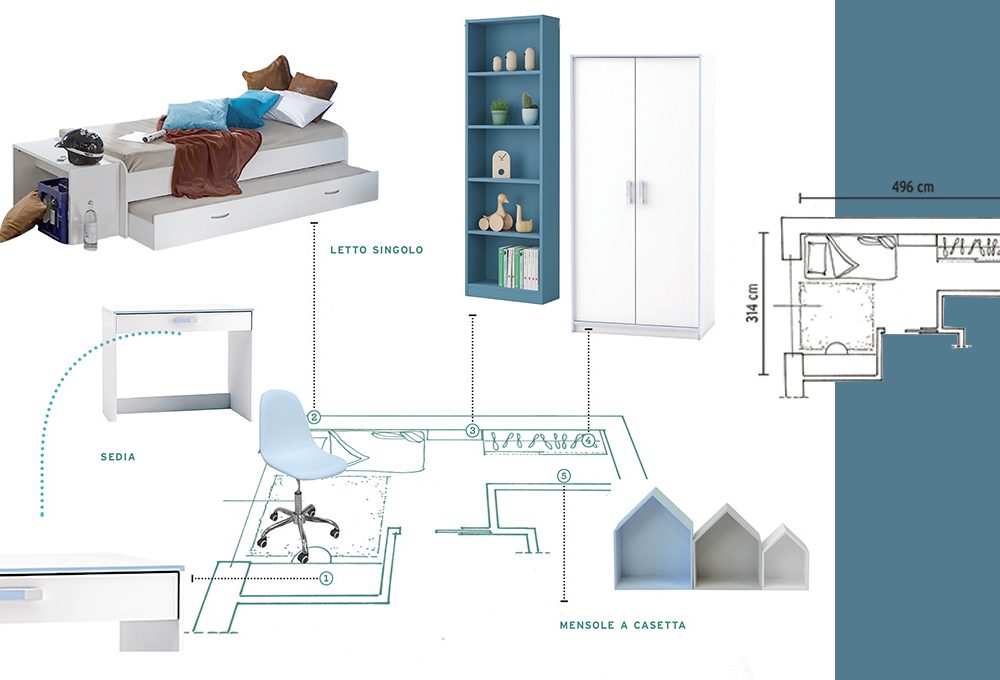 Il progetto: la stanza di 12 mq è stretta e deve ospitare 2 ragazzi. L’idea è di sfruttare due pareti adiacenti e lasciare, durante il giorno, spazio libero al centro. Il progetto prevede un’armadiatura con un modulo di letti a castello a ribalta e l’angolo sfruttato con scrivania a elle e delle mensole.