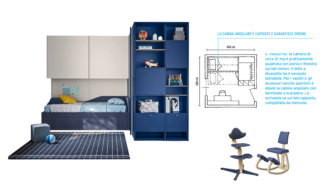 Il progetto: la camera di circa 12 mq è praticamente quadrata con porta e finestra sui lati minori. Il letto a divanetto ha il secondo estraibile. Per i vestiti e gli accessori (anche sportivi) è ideale la cabina angolare con terminale a scarpiera. La scrivania va sul lato opposto, completata da mensole.