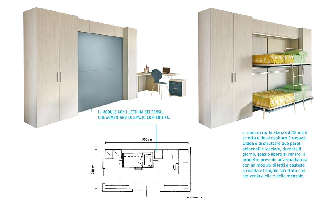Hai una camera doppia ‘a corridoio’ ossia larga meno di 250 cm? Se metti entrambi i letti a terra non hai più molto spazio per contenere e studiare: meglio un’armadiatura a ponte con letti a ribalta così di giorno li chiudi e lasci la stanza libera e le colonne ai lati sono per vestiti e accessori di stagione.