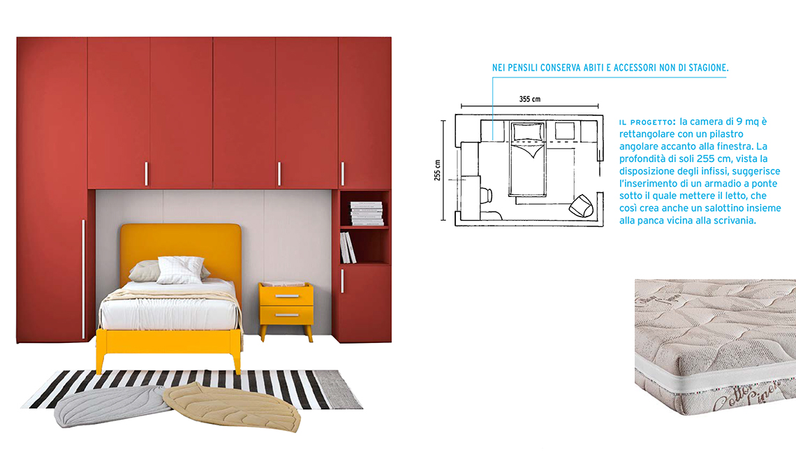 Il progetto: la camera di 9 mq è rettangolare con un pilastro angolare accanto alla finestra. La profondità di soli 255 cm, vista la disposizione degli infissi, suggerisce l’inserimento di un armadio a ponte sotto il quale mettere il letto, che così crea anche un salottino insieme alla panca vicina alla scrivania.